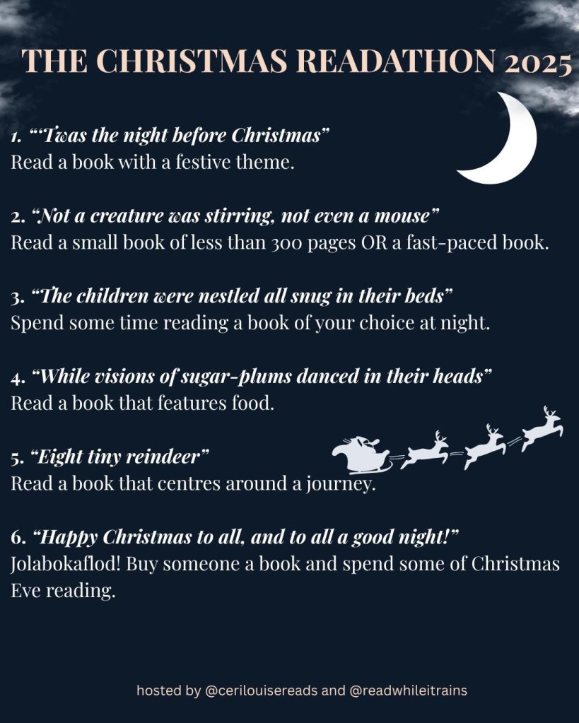 This year I’m hosting the Christmas Readathon again with Eva from Read While It Rains. We’ve decided to extend it for the whole of December to give more time for festive reading, and this year there are six prompts themed around the poem commonly known as The Night Before Christmas.